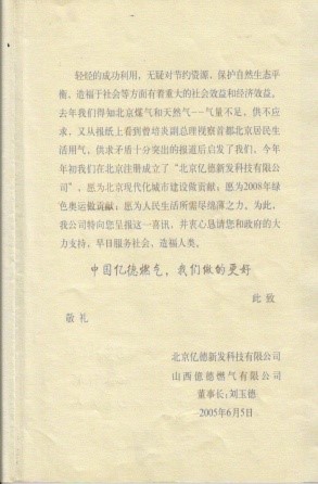 山西億德燃氣有限公司. 北京億德新發科技有限公司. 法人代表劉玉德: 2003年3月~2005年6月. 八次給黨中央. 國務院. 人大. 政協及有關部委呈報的輕烴常溫低壓冷冷制燃氣成熟. 造福人民的“喜報”:這是第八次喜報: